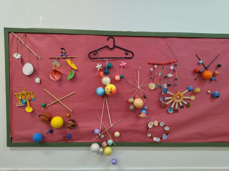 Los alumnos de 3º de primaria han creado móviles con su propia interpretación del universo. Desde el sistema solar hasta planetas y estrellas que están en su imaginación. Con está actividad hemos trabajado la inteligencia visual-espacial a través de varias asignaturas.