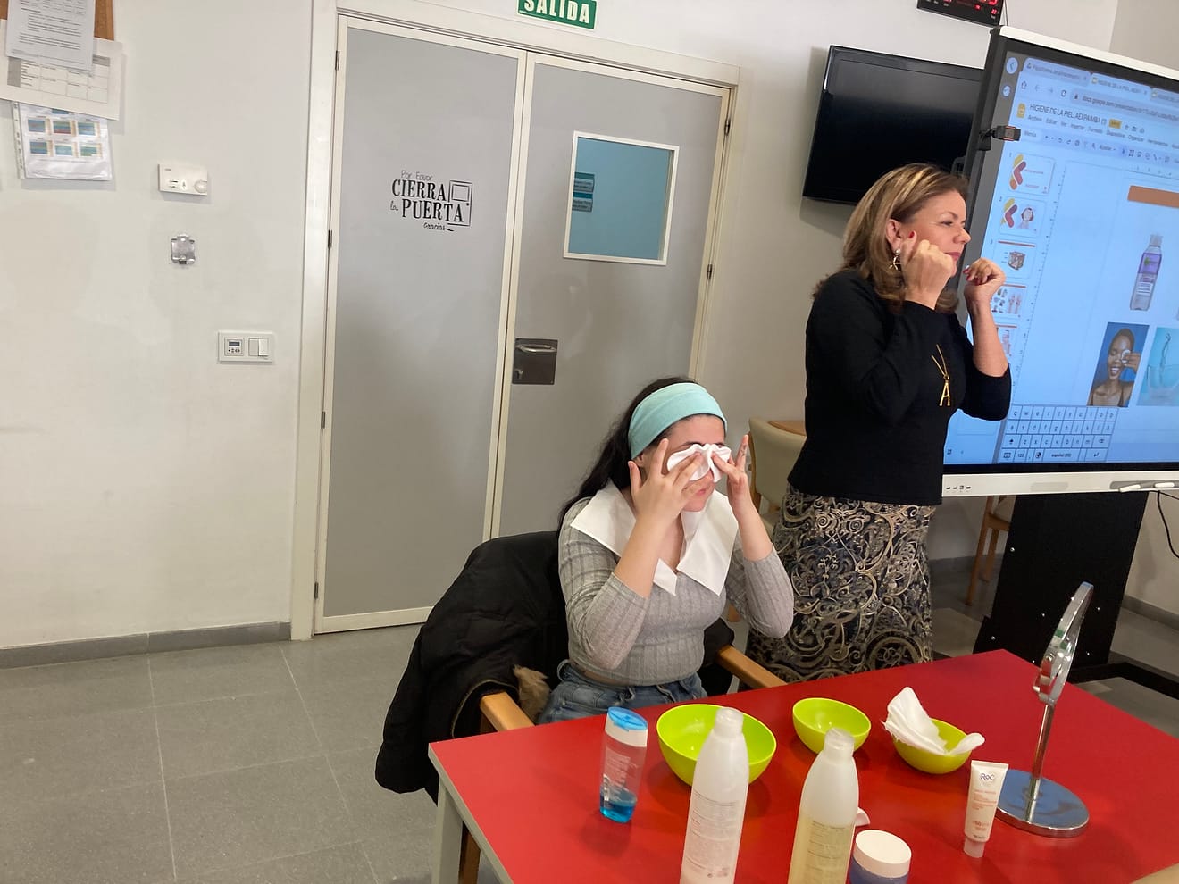 El profesorado y alumnado del Ciclo de Grado Medio de Estética y Belleza se han desplazado hasta el centro AEXPAINBA para realizar un taller de higiene facial.