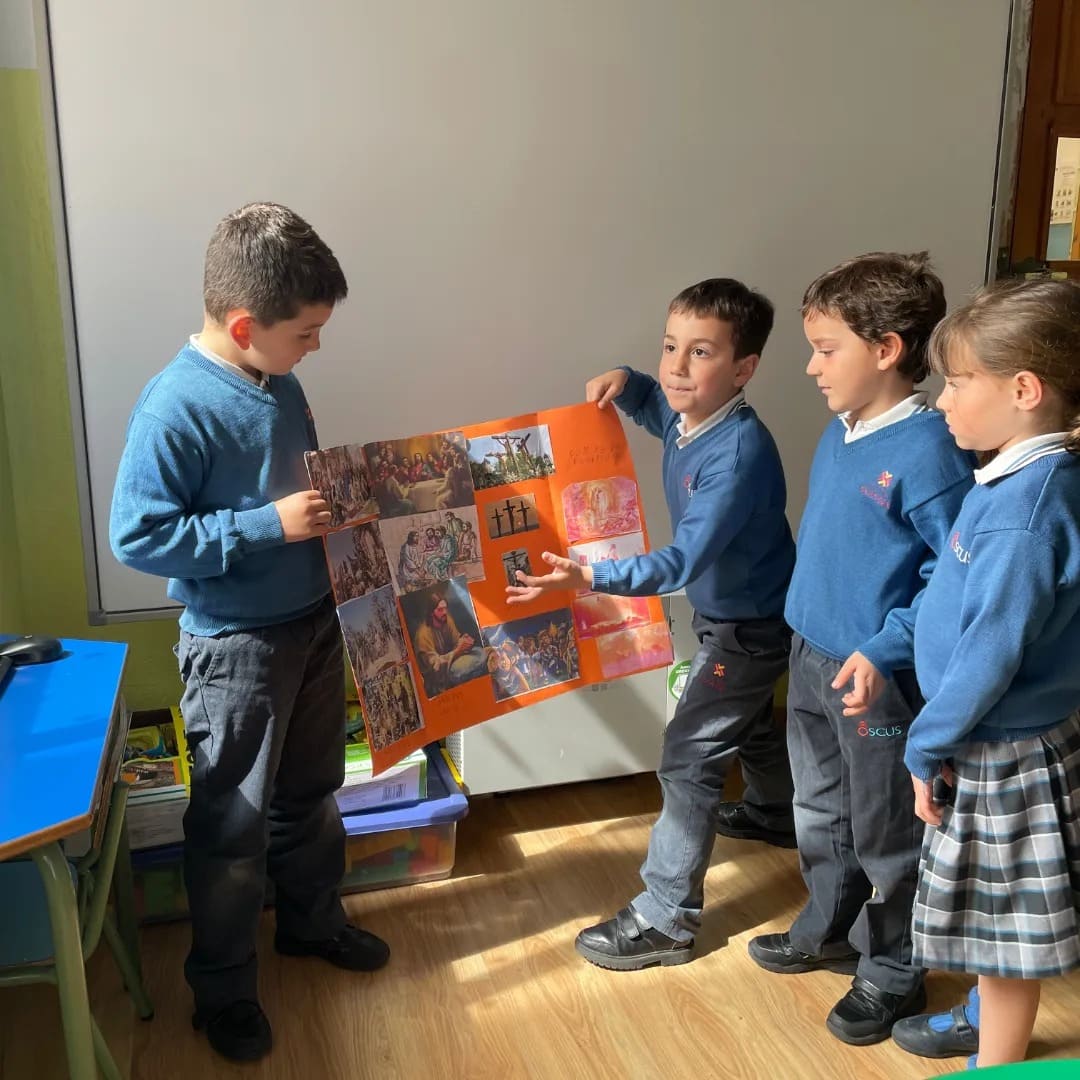 Esta metodología permite que alumnado muestre a sus compis lo que han trabajado y aprendido en las áreas curriculares. En esta ocasión los alumnos/as de 1⁰ de Primaria han compartido con los amigos/as de Educación Infantil un proyecto sobre la Semana Santa de Badajoz, mostrando sus murales y creaciones con pasos y curiosidades de las diferentes Hermandades que procesionaran la próxima Semana.