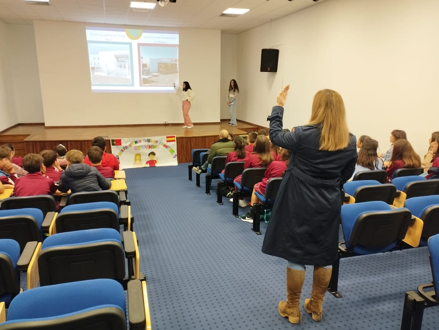 «Recepción por parte del Agrupamento de Escolas de Campo Maior recibiéndonos con unas Boas-vindas muito entusiastas cuando se volvieron a ver los alumnos de los dos centros. Seguidamente una presentación en el salón de actos muy emotiva de bienvenida.