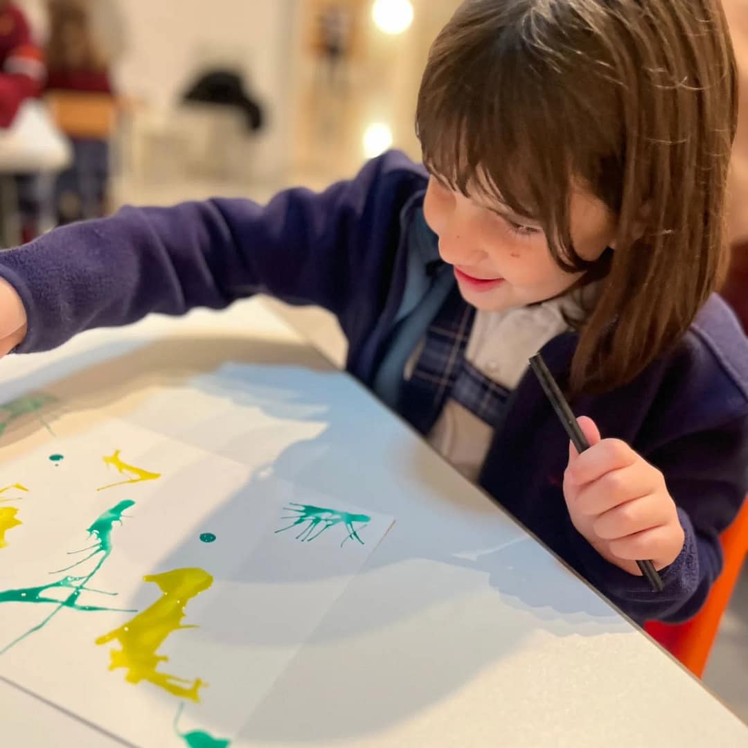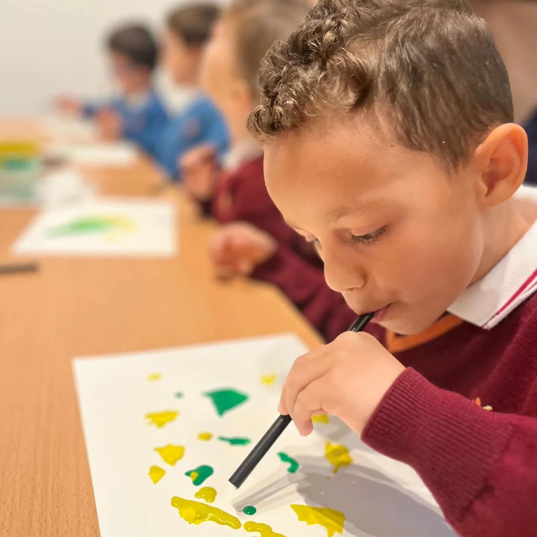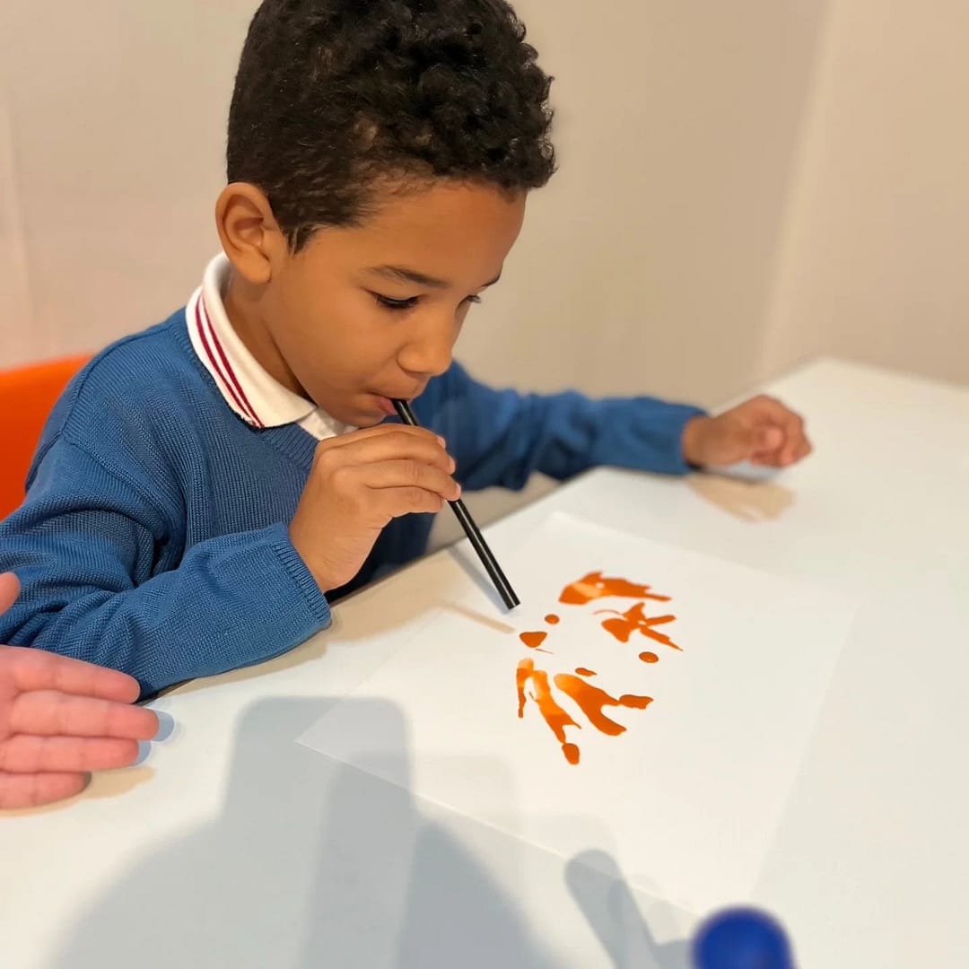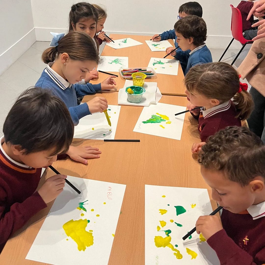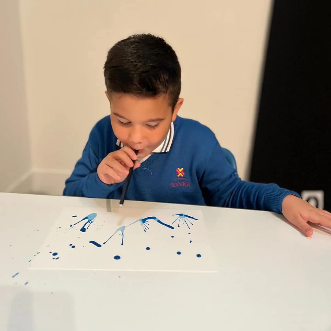La diversión llegó con el taller creativo donde los pequeños/as artistas se pusieron manos a la obra (¡y nunca mejor dicho!) para simular las técnicas aprendidas. En lugar de pinceles, utilizaron pajitas para soplar pintura sobre el papel, creando sus propias versiones llenas de color y originalidad.