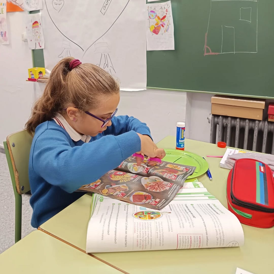 Lo han descubierto como contenido curricular dentro del área de Conocimiento, pero como no es lo mismo leerlo que aprenderlo a través del juego, están creando unos platos a escala con recortes de revistas donde tienen que hacer el ejercicio previo de clasificación según sean verduras, proteínas, cereales, fruta …diseñando un plato equilibrado y saludable.