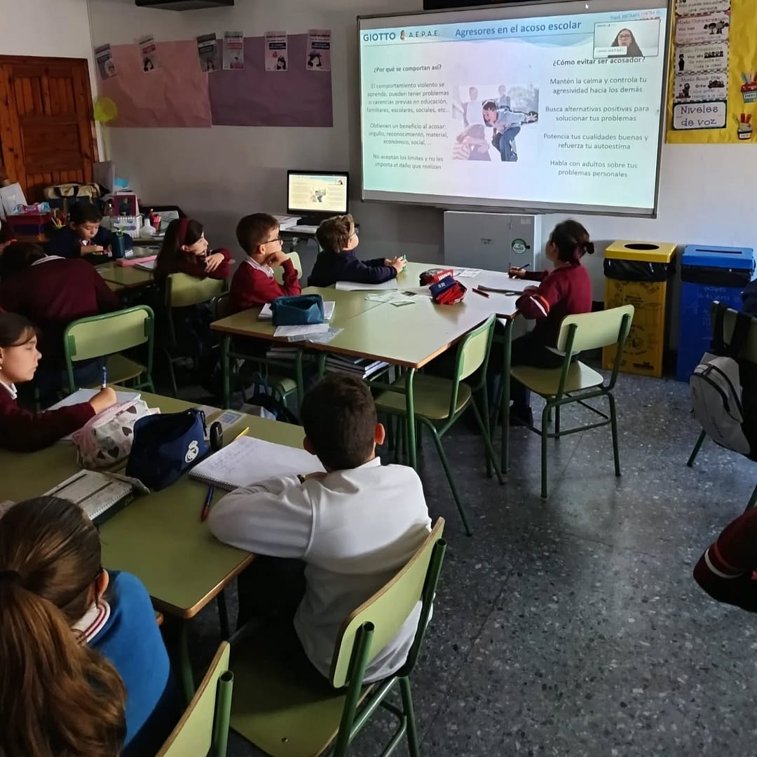 Alumnos/as de Primaria asistien a videoconferencia de sensibilización y prevención sobre el acoso escolar ofrecido por @giotto_spain al haber participado en el concurso escolar. Una oportunidad para conocer y diferenciar situaciones de acoso escolar, cómo actuar, pedir ayuda y desarrollar habilidades de empatía, asertividad y respeto. Gracias a @aepae_es por el contenido ofrecido en la sesión de forma profesional y adaptado a la edad del alumnado.