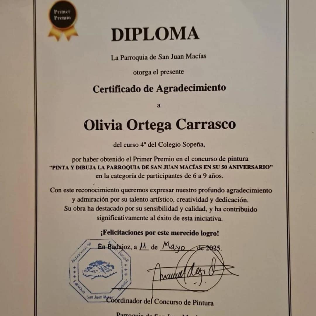 Nuestra alumna Olivia Ortega Carrasco, de 4⁰ de Primaria por el primer premio en su categoría, en el concurso de dibujo organizado por la parroquia San Juan Macías con motivo de su 50 aniversario.