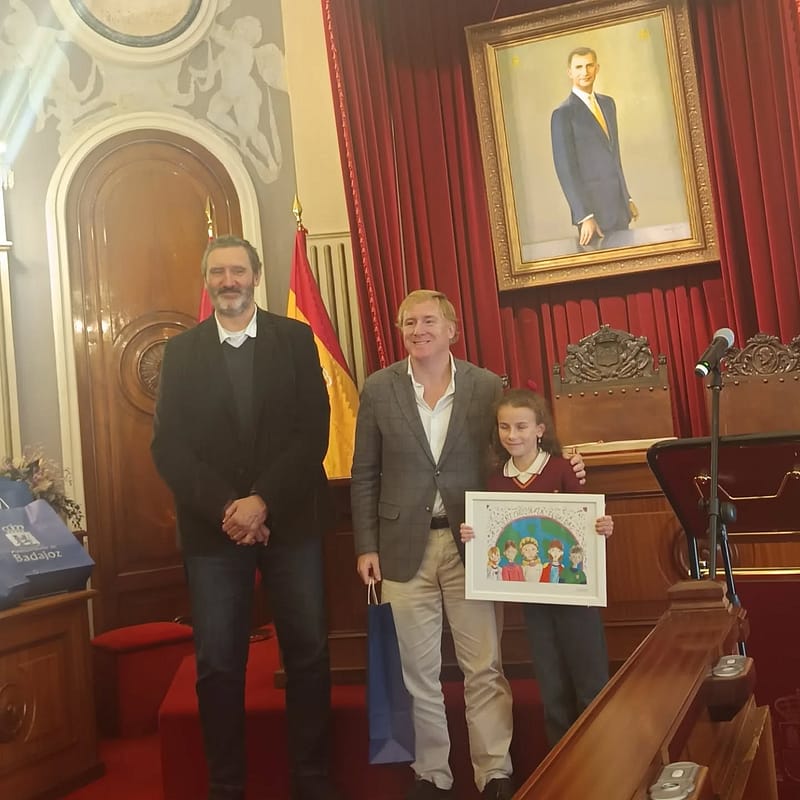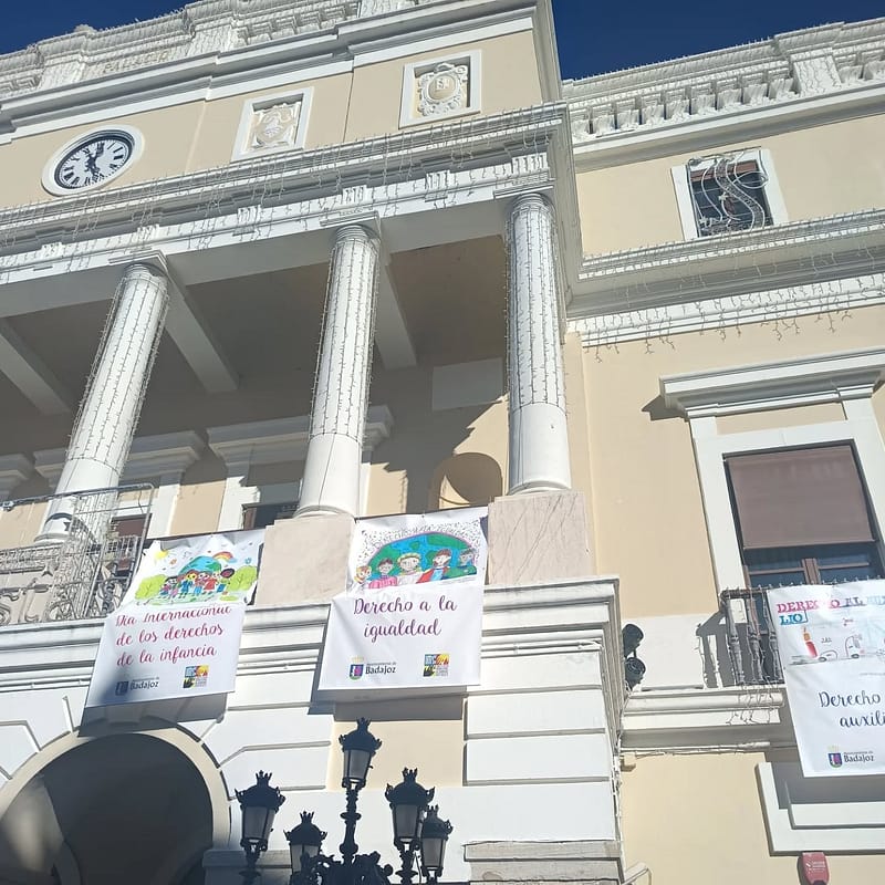 Puedes ver su dibujo en una gran lona en la fachada del Ayto. de Badajoz.