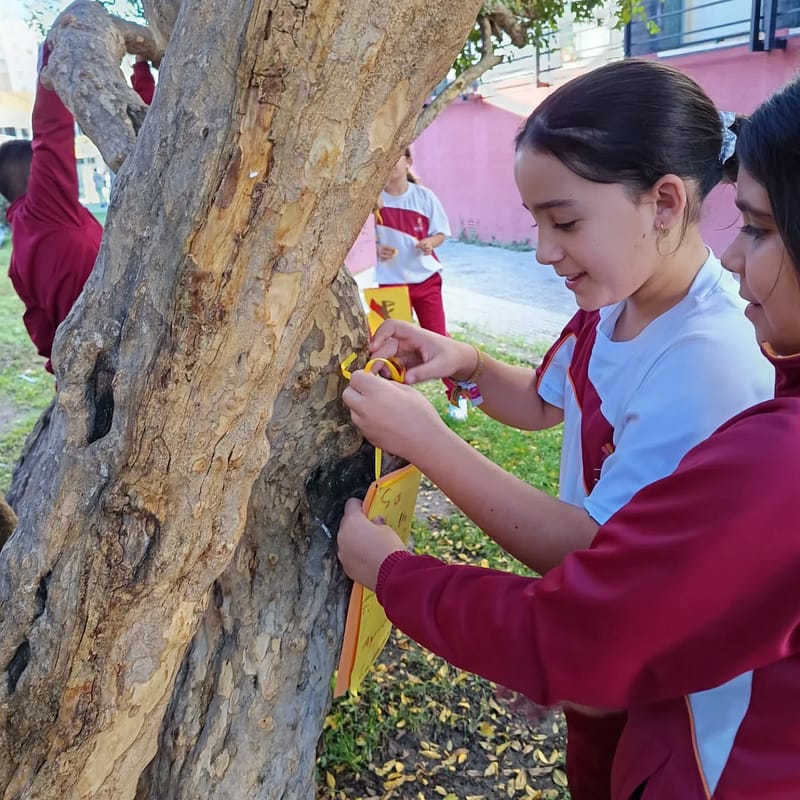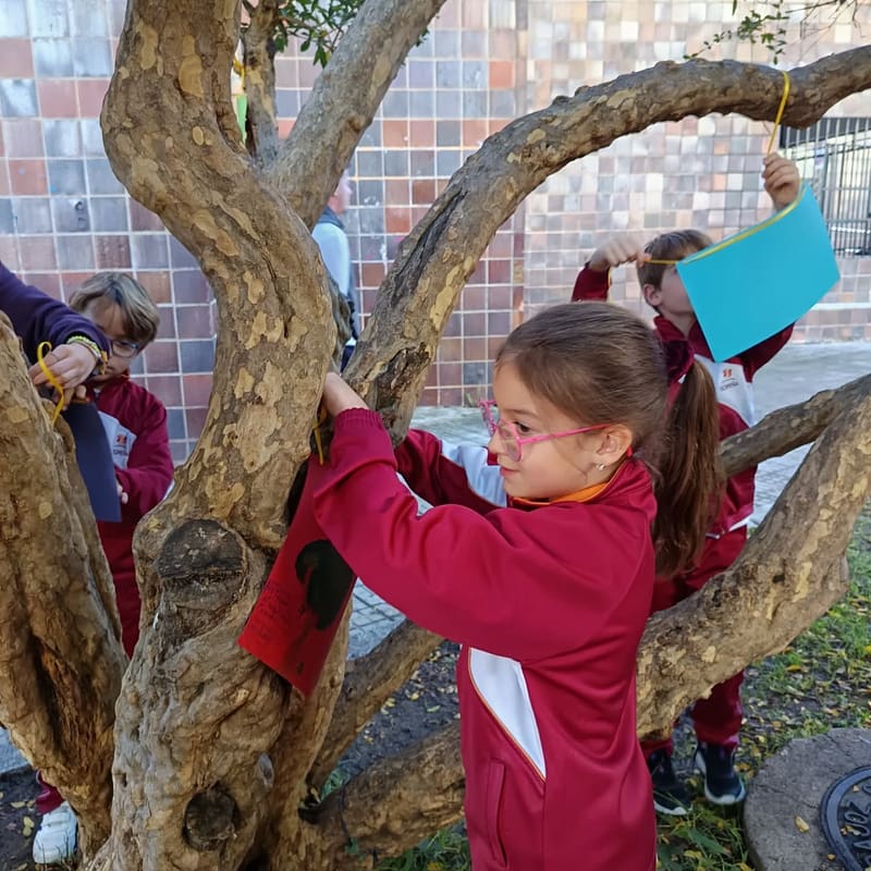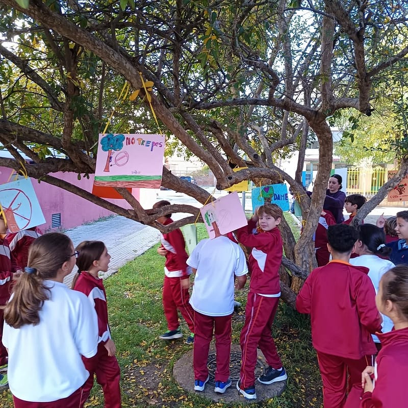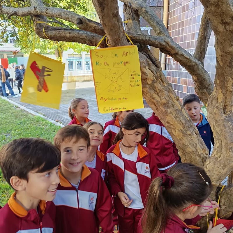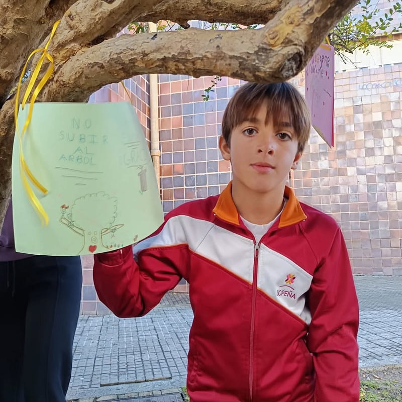 En clase han compartido como a la salida o entrada del cole hay muchos niños/as que se suben a un árbol próximo a la entrada y han decidido colocar unos carteles para concienciar y sensibilidad sobre la importancia de cuidar nuestra naturaleza