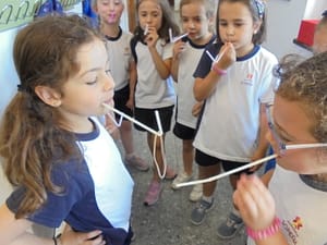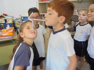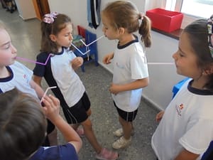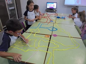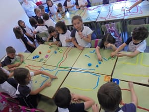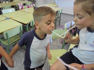 Los alumnos de 1º de Primaria celebran la recta final del curso con juegos cooperativos. Han elaborado un laberinto con plastilina en las mesas de los diferentes grupos y con un trocito de papel de seda han hecho una pelota. Con una pajita han recorrido el circuito soplando la pelota sin salirse.