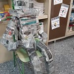 Han utilizado cajas, botellas, tapones, botes…tanto para la estructura como para el cuerpo; posteriormente lo han forrado con papel de periódico mojado en cola y agua. Le han dado forma al cuerpo en la unidad de CCNN «El cuerpo humano» cuidando las articulaciones, identificando los huesos…