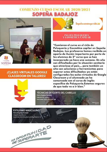 «Comienza el curso en el ciclo de Peluquería y Cosmética capilar en @Sopeña Badajoz Los profesores hemos recibido un aporte de ilusión importante por parte de los alumnos de 2o curso que se han incorporado ya hace una semana. Un año con dificultades por la situación sanitaria que atraviesa el país… pero también un año con soluciones y herramientas para superar estas dificultades: ya están configuradas las aulas virtuales de Google Classroom y el alumnado ya ha comenzado con el curso de inglés específico de Peluquería.Estamos seguros de que todo va a ir bien.»