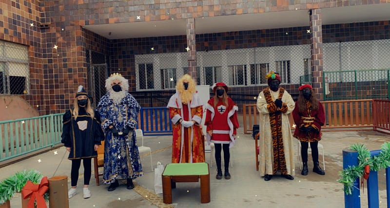 Ha sido una visita que ha contado con todas las medidas de seguridad; Melchor, Gaspar y Baltasar han venido acompañados de sus pajes con mascarilla y ha preparado con mucho mimo los regalos, dejando los camellos en la puerta del colegio…