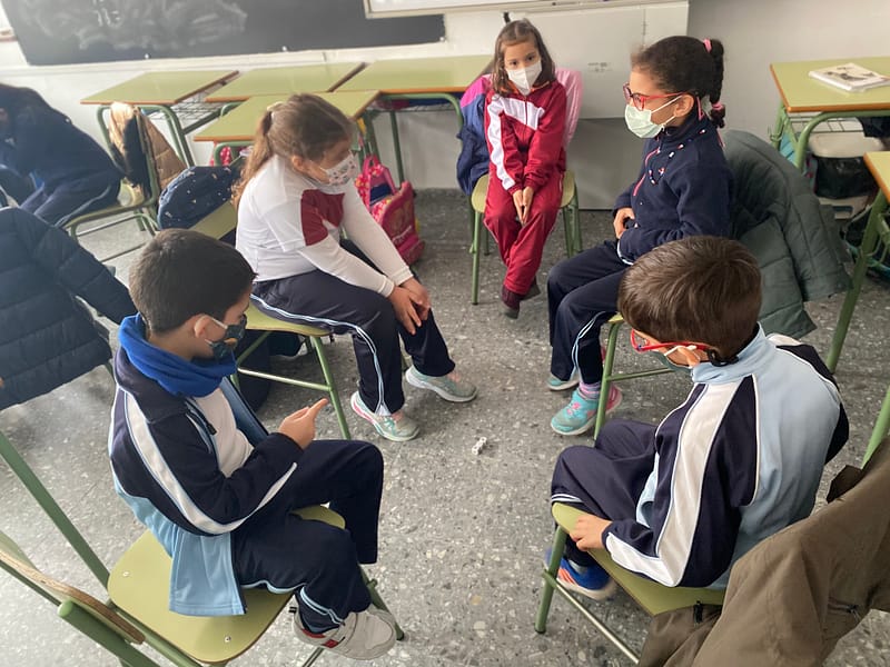 Los alumnos de primero de primaria guardando todas sus medidas de seguridad, han realizado hoy en grupo cuentos trabajando con los story cubes.
