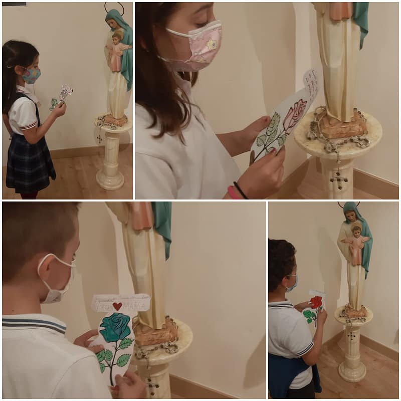 Los alumnos de 1º y 2º de E.P. terminan el mes de mayo con una ofrenda floral a la VIRGEN MARÍA en la capilla de nuestro colegio.