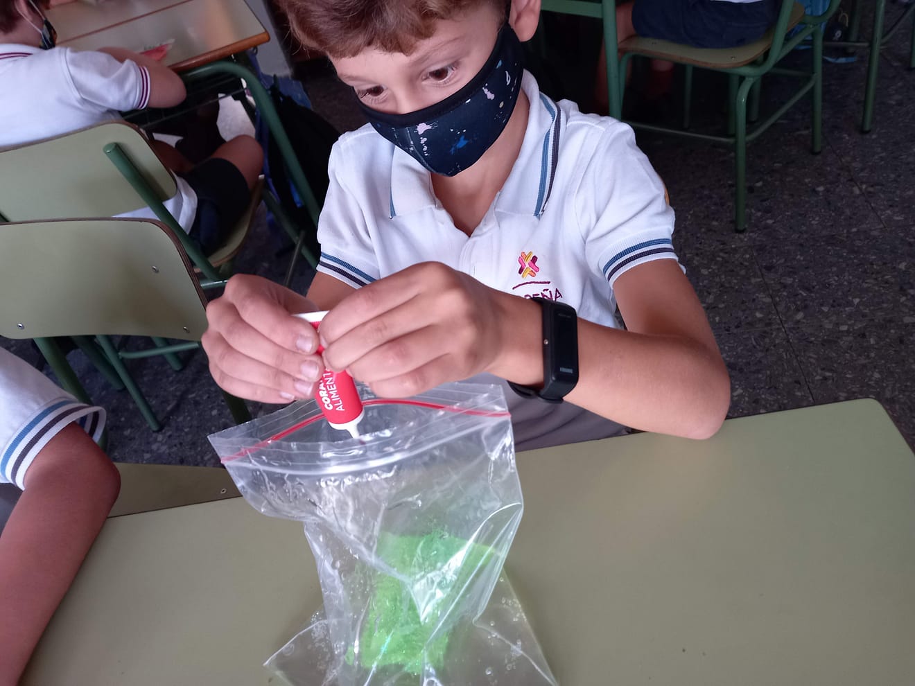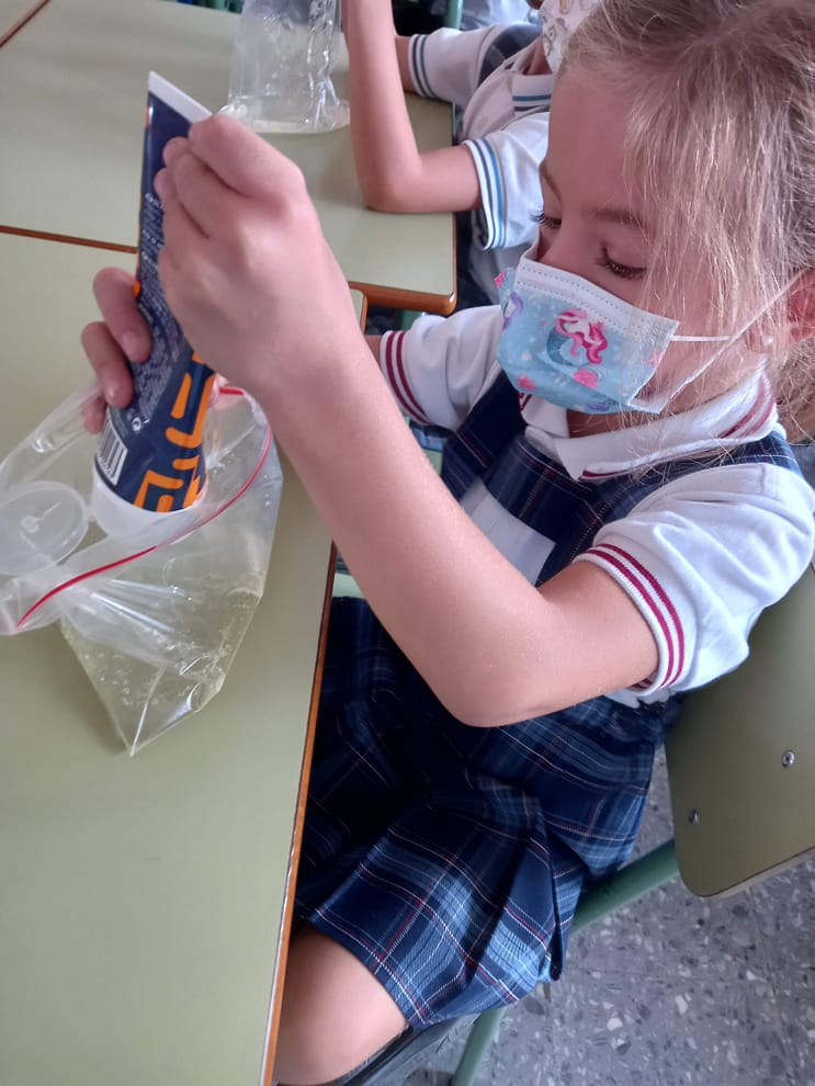 El alumnado de 1º de primaria ha elaborado en el área de lengua unas bolsas sensoriales con gomina, brillantina y colorante para poder escribir los fonemas que vamos trabajando cada día. Hemos reproducido el abecedario, la inicial de nuestro nombre, sílabas…
