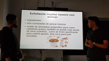 Nuestros alumnos de 2º de Peluquería, siguiendo una Metodología activa que es propia de nuestro Centro y potenciando el uso de productos naturales, han realizado en el módulo de Análisis Capilar una actividad en la cual han diseñado un exfoliante natural para el cuelro cabelludo y que han expuesto en clase. La próxima semana lo pondrán en practica en el taller. Destacamos el entusiasmo y el interés de los alumnos por este trabajo.