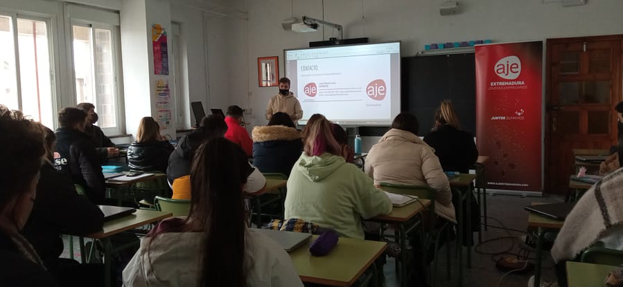 Nuestros alumnos de 2º de Asistencia a la Dirección han recibido la visita de AJE Extremadura (Asociación de Jóvenes Emprendedores) donde nos han contado historias personales de emprendimiento abriendo así una ventana a otra oportunidad más de empleo, el autoempleo.
