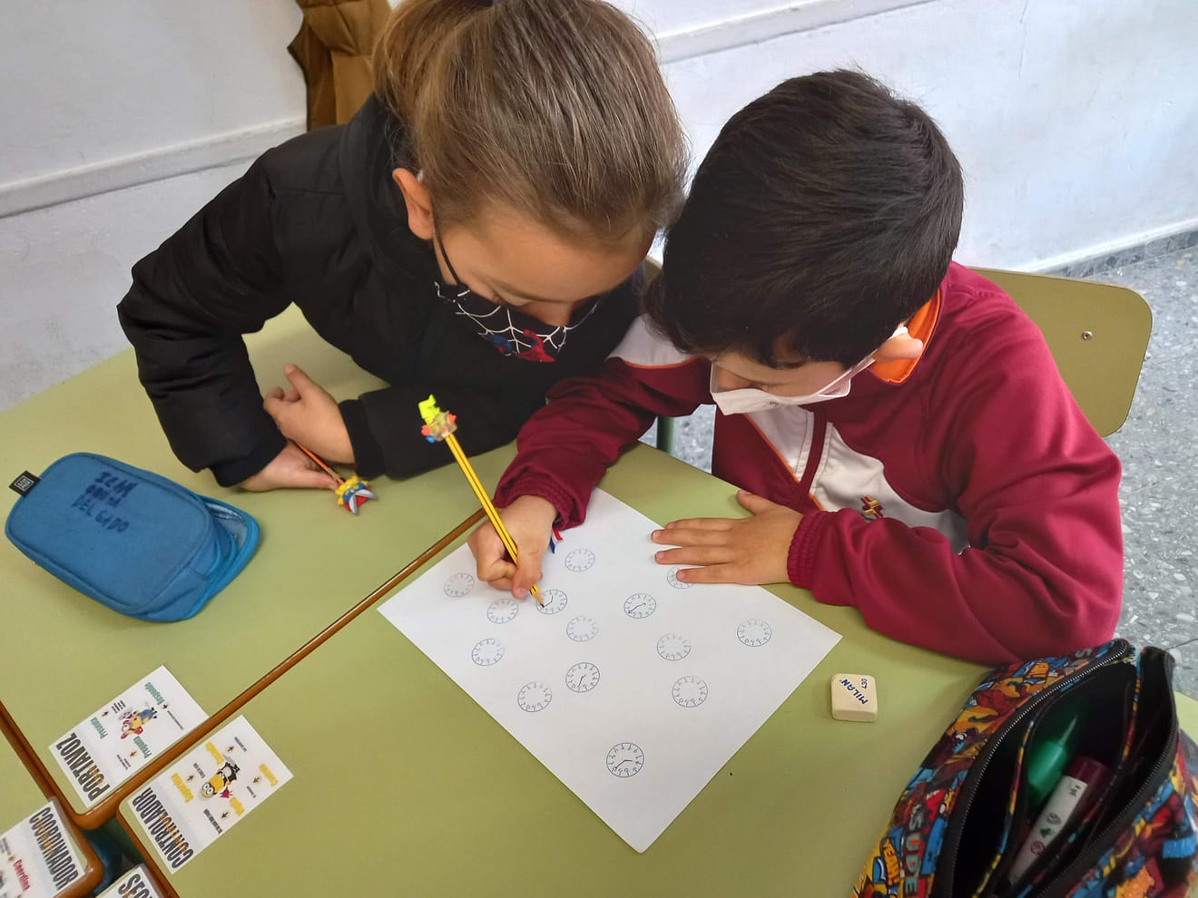 El grupo de 1º de Primaria continúa descubriendo el mundo de las horas y lo hace de forma lúdica, divertida y desarrollando habilidades del trabajo cooperativo.