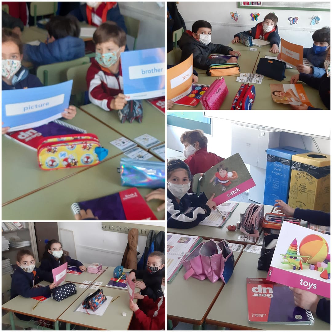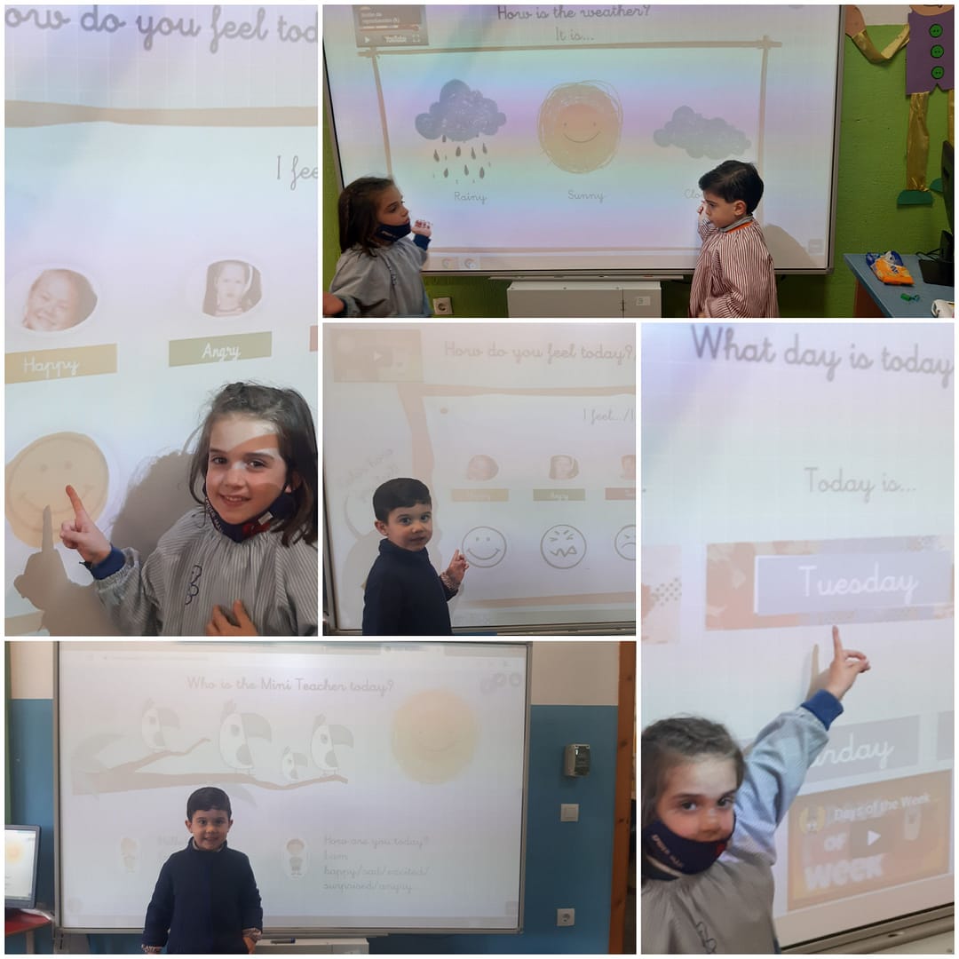 Los alumnos de infantil y primaria realizan sus rutinas, repasan los días de la semana, expresan sus emociones, el tiempo, el abecedario…
