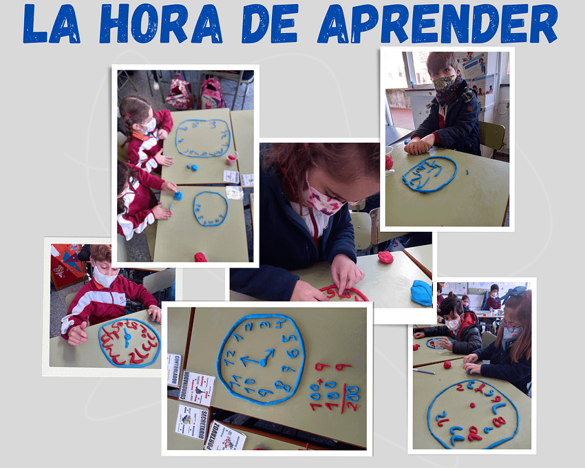 Porque son muchas las formas de aprender la hora, los alumnos/as de 1º de Primaria ha realizado una sesión de repaso a través de diferentes maneras, a través de la música con la canción de los «esqueletos», con el cuerpo (inteligencia corporal), con un video explicativo (visual, auditivo)…de todas estas maneras el alumnado ha descubierto las horas en punto y las medias horas; no obstante, para afianzar el contenido han elaborado un reloj con plastilina, donde han tenido que hacer los números, la esfera, las agujas…una forma más de repasar un concepto previo a la prueba de evaluación.