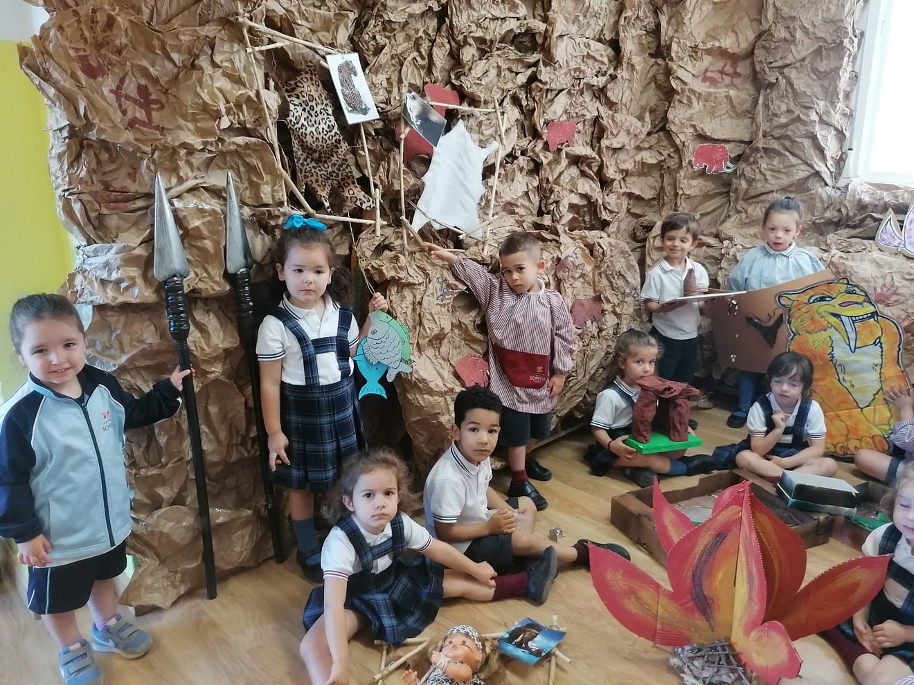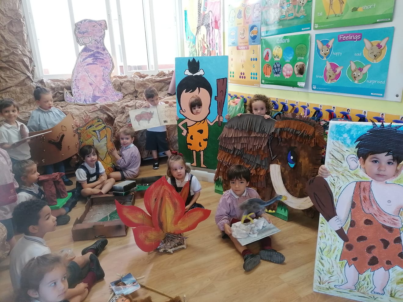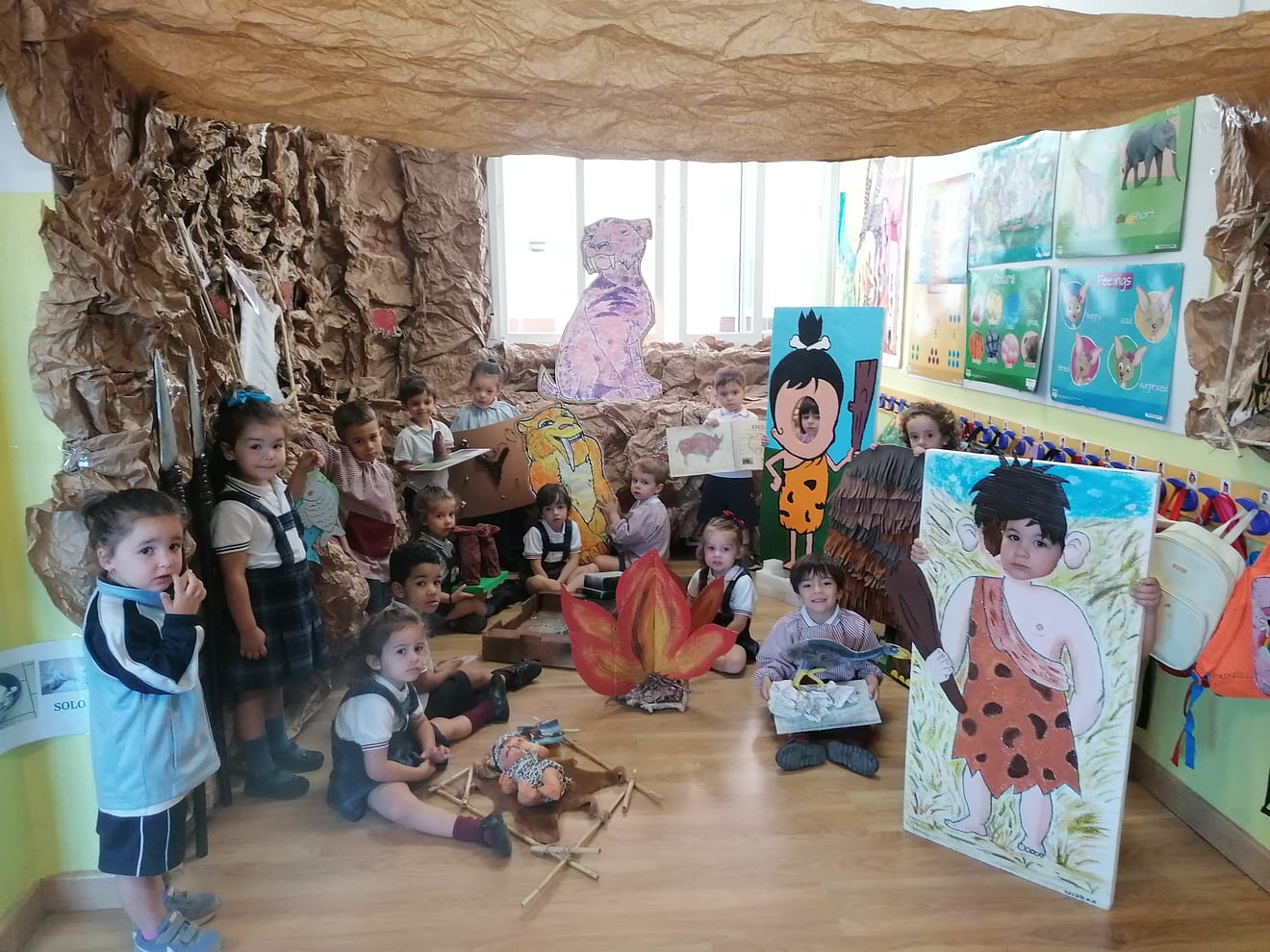 Hemos convertido nuestra clase en caverna y con la ayuda de las familias, la hemos decorado con diferentes objetos y animales típicos de esta era.