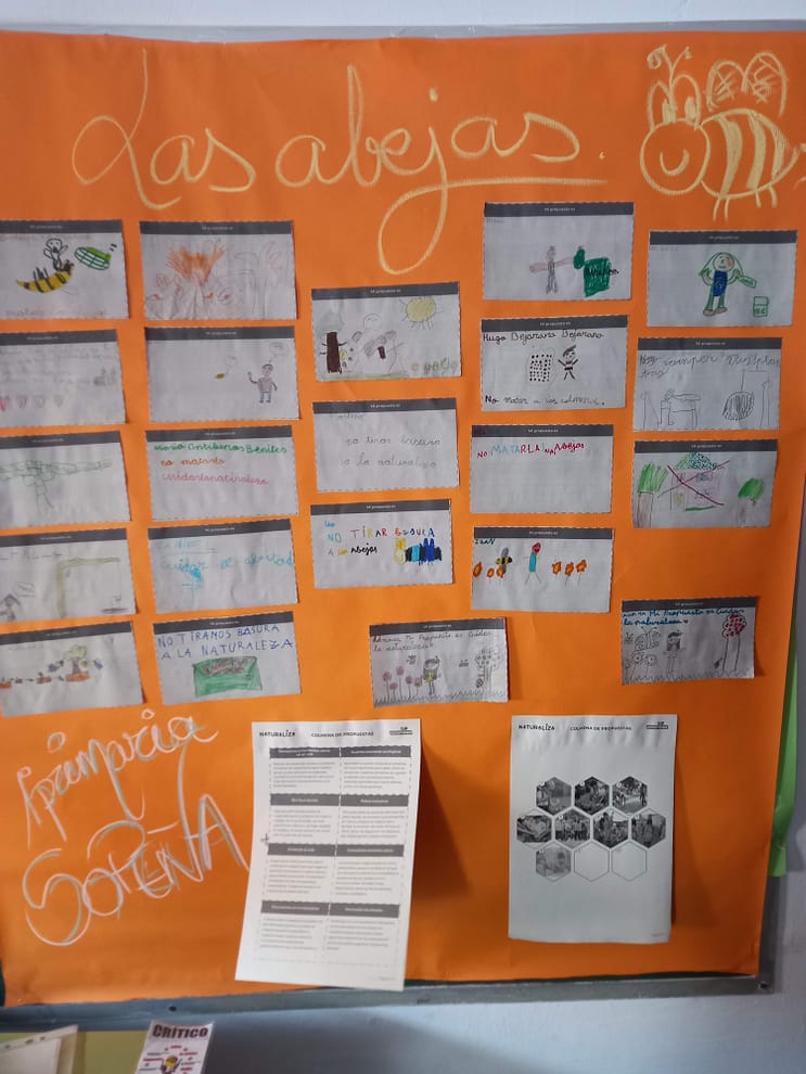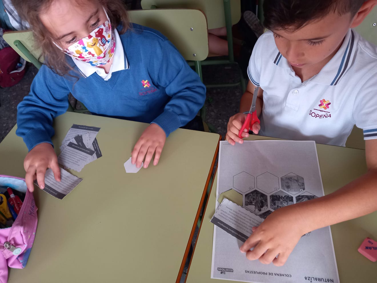 El alumnado de Primero de Primaria ha desarrollado una actividad enmarcada en su proyecto actual relacionado con el mundo de las abejas. Han descubierto la importancia de la polinización y la función tan vital que tienen estos pequeños insectos. Trabajando por grupos han desarrollado una propuesta didáctica de Naturaliza -Ecoembes- donde recortar colmenas con imágenes y asociarlas a propuestas relacionadas con su cuidado.