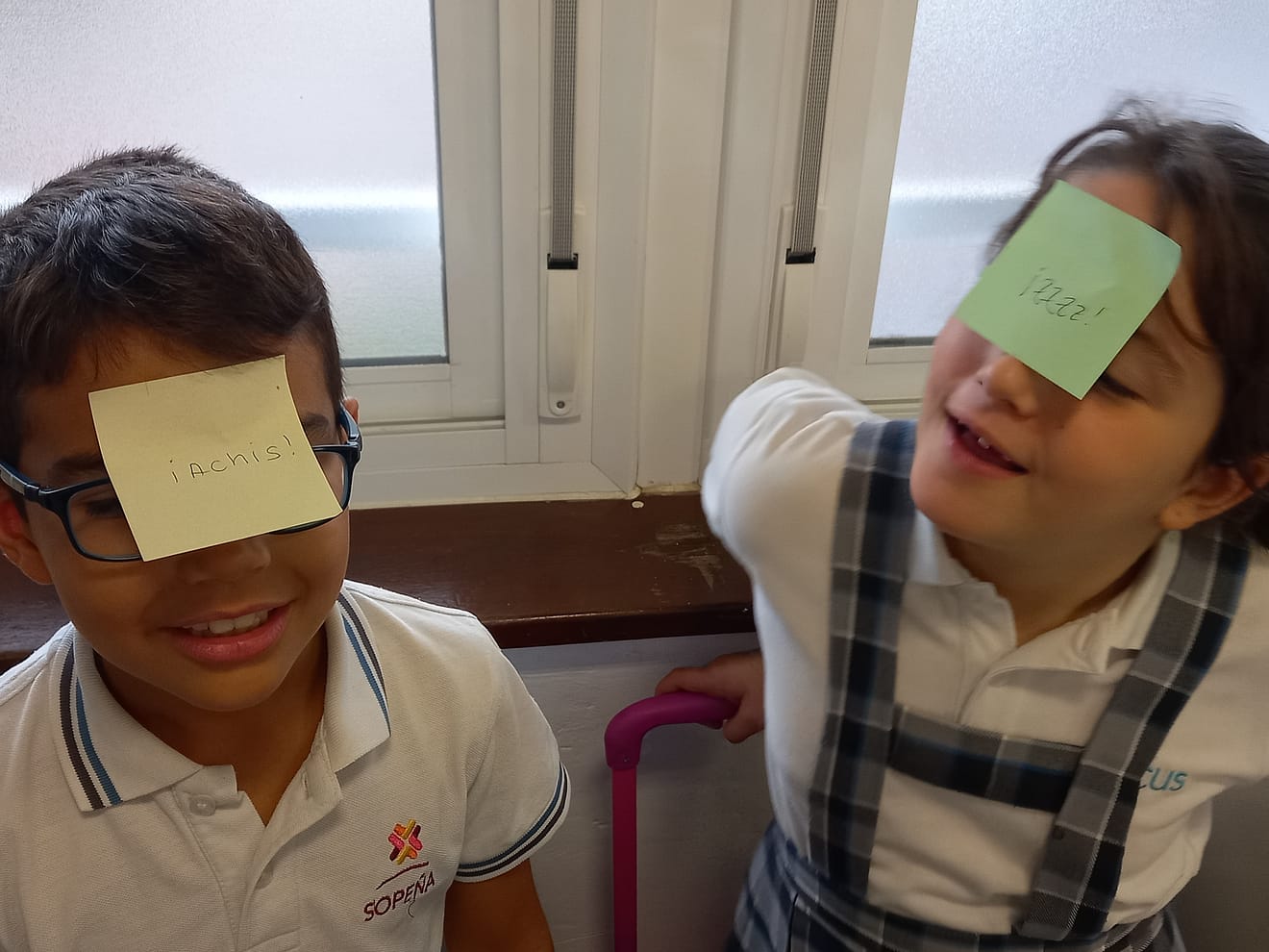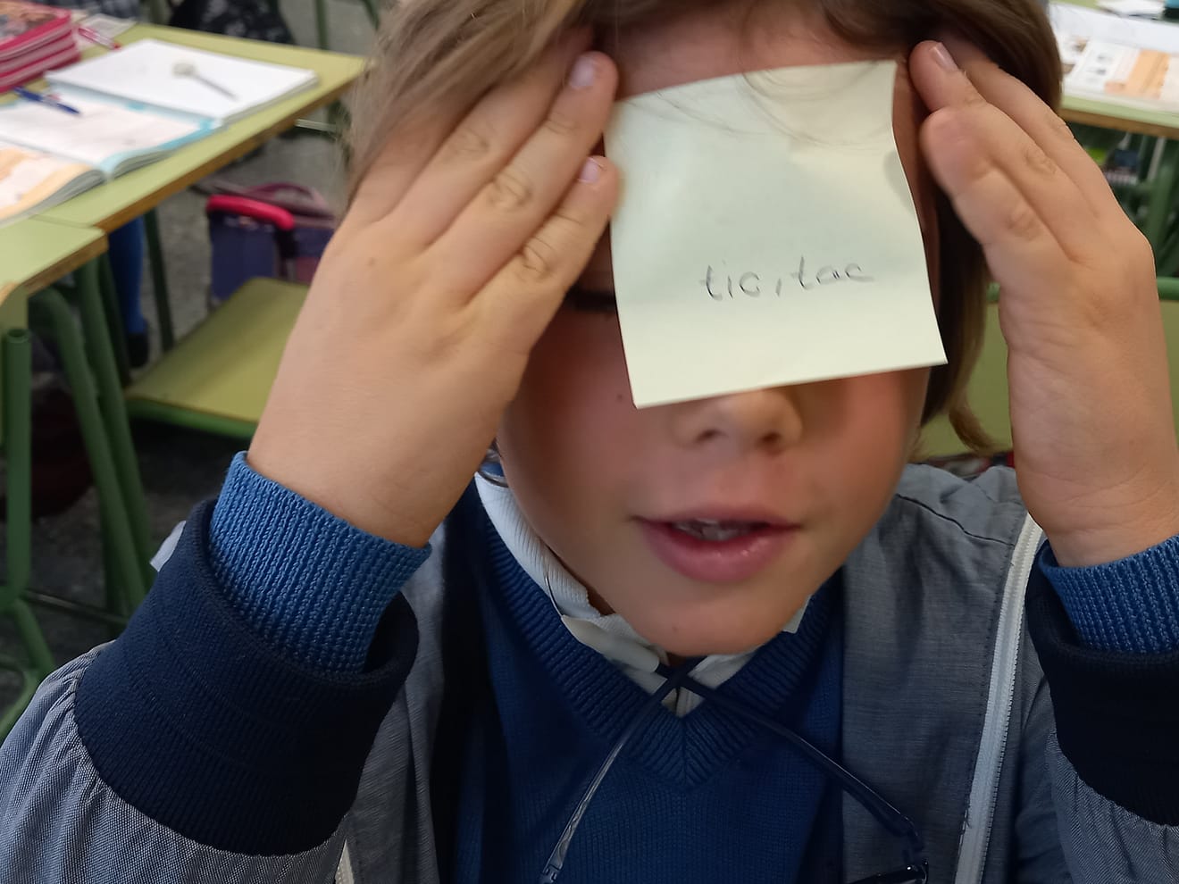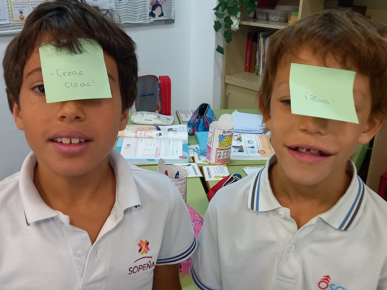 Los alumnos/as de Primaria descubre las onomatopeyas y averiguan qué objeto, animal o máquina son a través de un postit pegado en la frente.