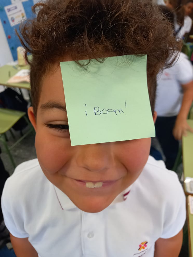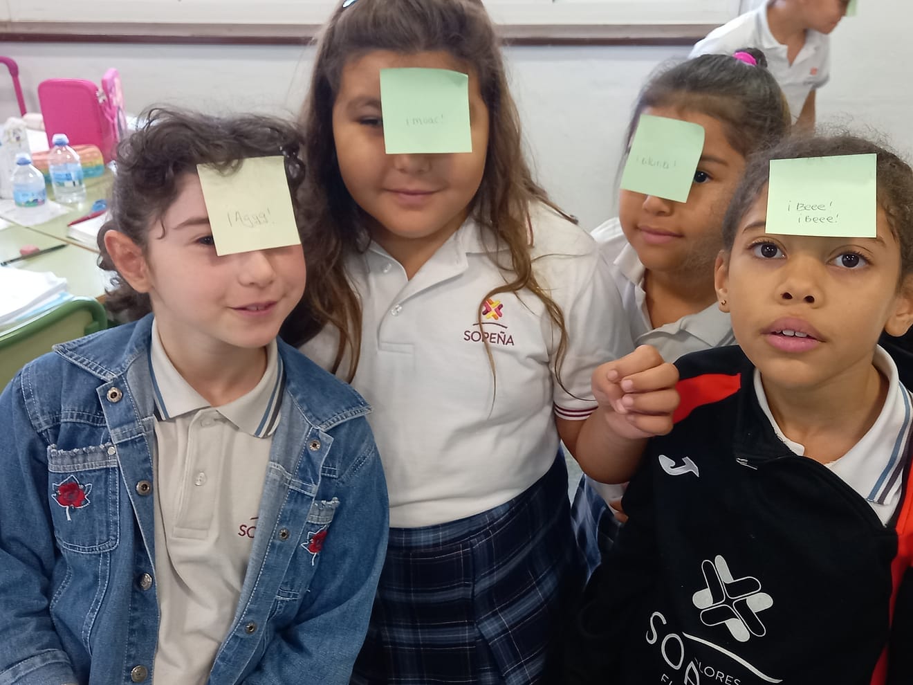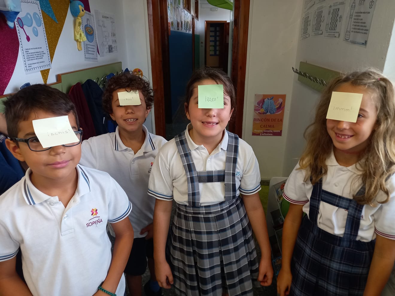 Los alumnos/as de Primaria descubre las onomatopeyas y averiguan qué objeto, animal o máquina son a través de un postit pegado en la frente.