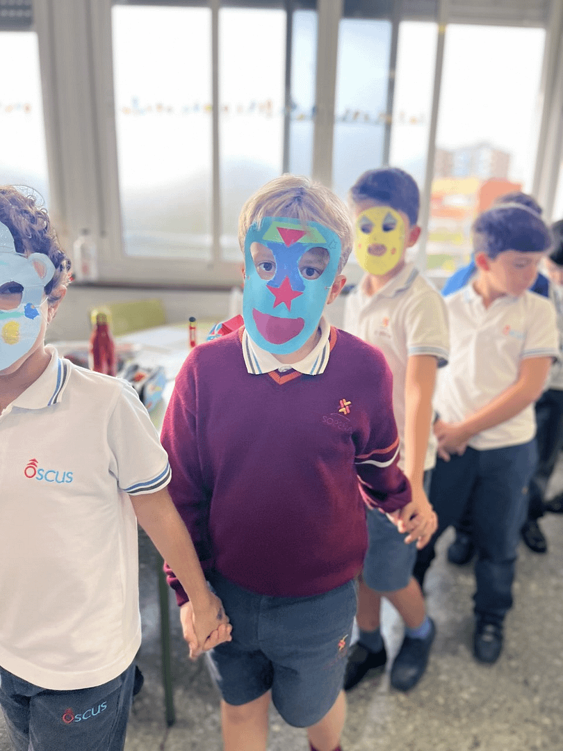 Los alumnos de 3º de E.P. previa elaboración de sus propias máscaras han aprendido a bailar danzas típicas de Perú Bolivia.