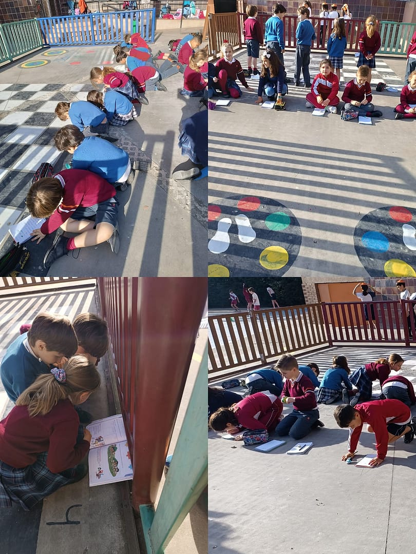 Hoy nos toca dictado loco, los alumnos tienen que memorizar las partes del dictado y luego escribirlos en sus libretas.
