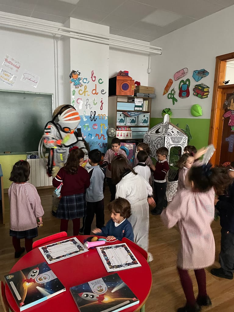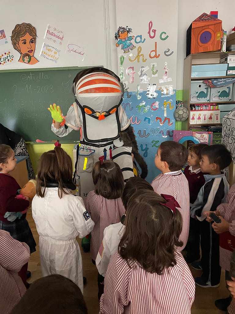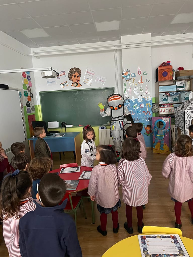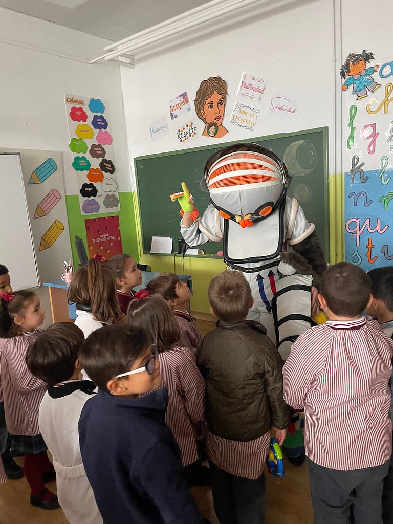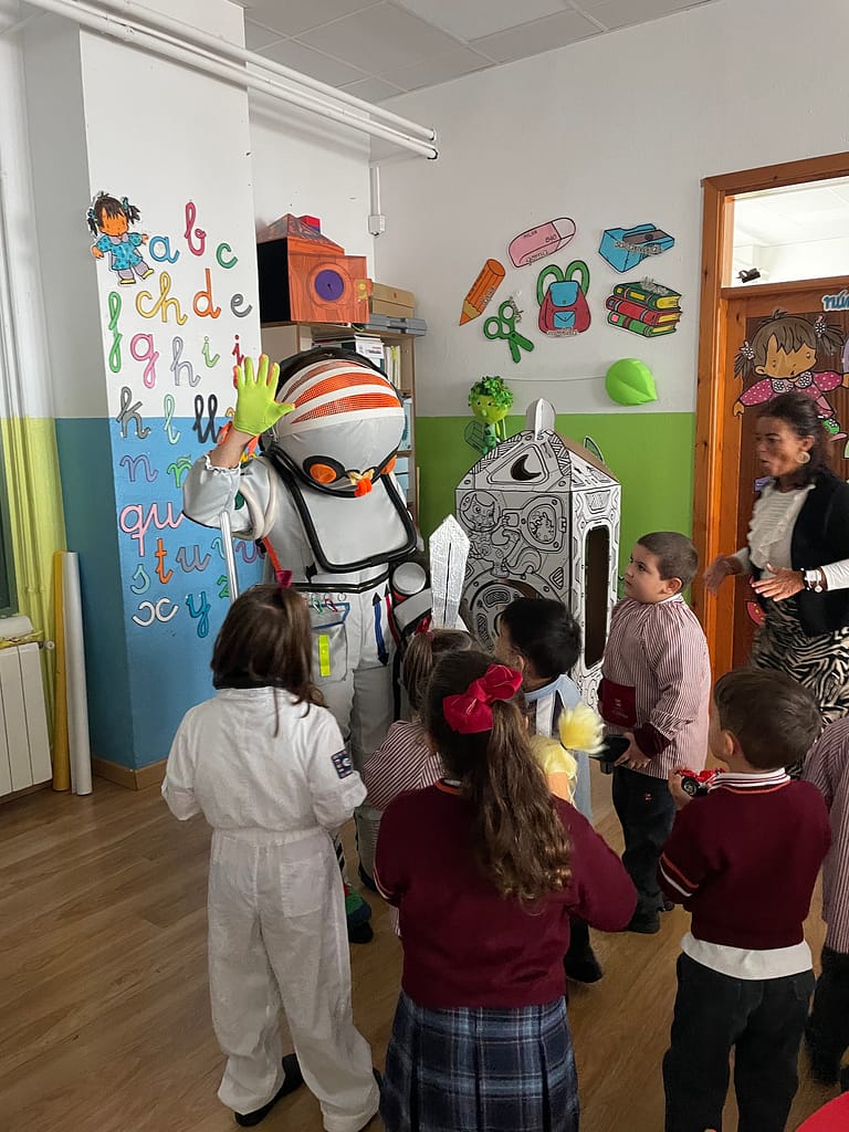 El alumnado de Educación infantil , 5 años, se ha encontrado con una gran sorpresa en clase al tener que entrar en un cohete espacial. Una astronauta les ha visitado y les ha contado los misterios del espacio exterior, curiosidades sobre los planetas, las estrellas y las galaxias. Han compartido un momento muy divertido todos llegando a cantar la canción de los Planetas y hacerse algunas fotos en grupo.