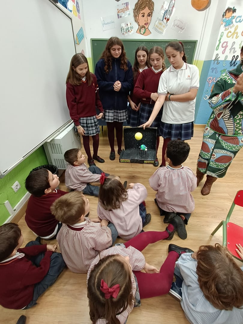 Dos grupos de alumnas de 1° ESO han visitado al alumnado de infantil con las maquetas de la Luna y la Tierra que construyeron en la asignatura de Biología, con el objetivo de explicar cómo se mueven estos cuerpos con respecto al Sol y los demás planetas.