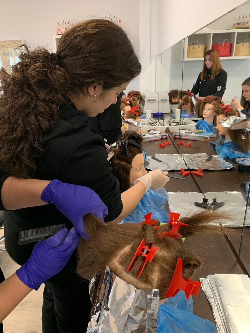 Nuestro alumnado de 2º peluquería y cosmética capilar, realizando unas mechas de paquete en el módulo de coloración capilar.