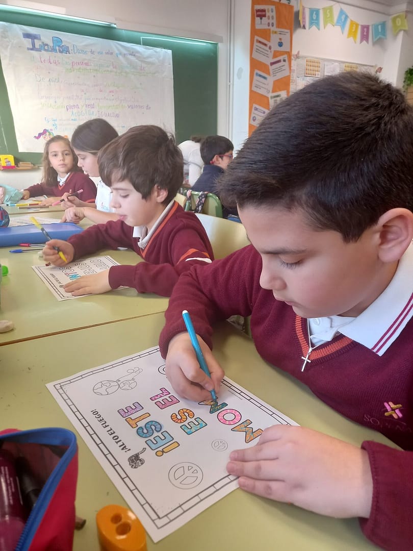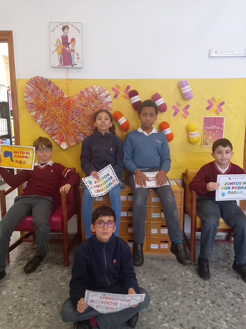 Durante esta semana estamos viendo y descubriendo el mensaje de la canción «alto el fuego», recogiendo nuestros compromisos para la paz y haciendo visible en el colegio carteles relacionados con esta iniciativa que auna miles de colegios de España.