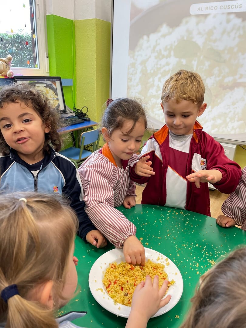 El alumnado de 3 años está cada vez más inmerso en su proyecto «Desierto a la vista» y es por ello que han querido degustar, probar y experimentar con las texturas y sabores a tarves de una de las comidas más típicas del desierto del Sáhara, el cuscus, y qué mejor forma de aprenderlo que siendo protagonistas de un menú típico de esa zona. A nuestro alumnado de Educación Infantil le ha encantado este plato, y tú, ¿lo conocías?